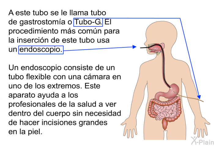 A este tubo se le llama tubo de gastrostomía o Tubo-G. El procedimiento más común para la inserción de este tubo usa un endoscopio. Un endoscopio consiste de un tubo flexible con una cámara en uno de los extremos. Este aparato ayuda a los profesionales de la salud a ver dentro del cuerpo sin necesidad de hacer incisiones grandes en la piel.